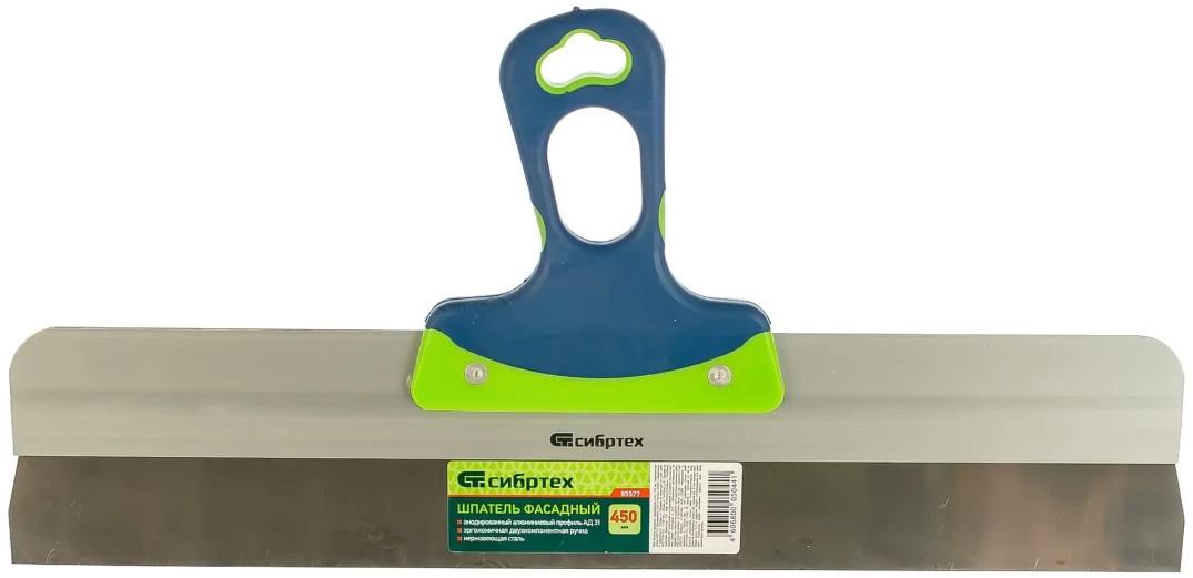 Фасадный шпатель Сибртех 85577 с рабочим полотном шириной 450 мм из нержавеющей стали и 2-компонентной рукояткой предназначен для нанесения, выравнивания и сглаживания отделочных составов, а также проведения других ремонтно-отделочных работ. Инструмент оптимально подходит для заглаживания зашпаклеванных швов.