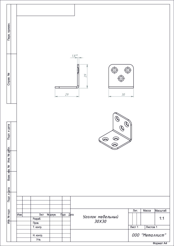 Уголок мебельный 30х30х30 цинк Кунгур - тип крепежного элемента, который обеспечивает стяжку двух плоских элементов мебели из различных материалов под углом 90 градусов. Уголок изготовлен из оцинкованной стали, благодаря которой он будет иметь долгий срок службы, сохраняя свои параметры и внешний вид.