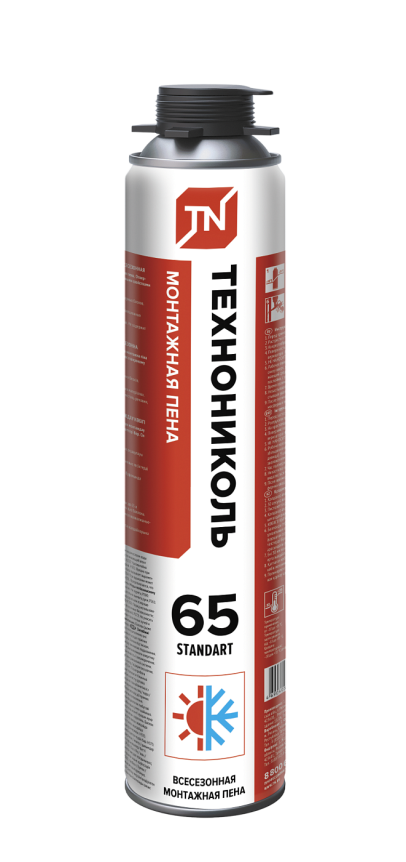 Монтажная пена ТЕХНОНИКОЛЬ 65 STANDART всесезонная представляет собой однокомпонентный полиуретановый материал в аэрозольной упаковке. Монтажная пена отличается высокой эластичностью, контролируемым объемом монтажного валика, высокими показателями тепло- и звукоизоляции, активным первичным и умеренным вторичным расширением. Пена обладает хорошей адгезией к большинству строительных материалов, за исключением фторопласта, силикона и полиэтилена.