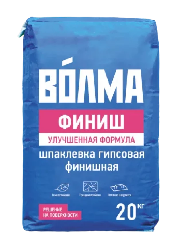 «ВОЛМА-Финиш» - сухая шпатлевочная смесь на основе натурального гипсового вяжущего с размером частиц менее 0,2 мм, минерального наполнителя и модифицирующих добавок, обеспечивающих трещиностойкость и повышенную адгезию.