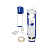 Арматура АС-17.1 кнопочная с клапаном нижней подводки воды АН-01. Данная арматура качественно отличается от штоковых арматур, при этом она включает в себя лучшие их качества. Арматура универсальная: устанавливается и в "средние" бачки (высота до крышки бачка от 310 мм до 390 мм), и "высокие" (высота до крышки бачка 420 мм). Конструктивные решения, выгодно отличают эту модель от арматуры других производителей. Существует возможность производить регулировку положения кнопки, что позволяет устанавливать арматуру в бачки с несовпадением по вертикали отверстия в крышке бачка и смывного отверстия (смывные бачки 2го и 3го сорта). Плоский донный клапан обеспечивает плотное запирание смывного отверстия, исключая просачивание воды в унитаз. Использование металлической пружины в кнопке значительно увеличивает надежность кнопочного узла. Наличие регулируемой трубы перелива исключает течь воды через верх бачка. В данной модели используется наполнительная арматура нижней подводки, прямого действия. Запирание происходит за счёт передачи движения от поплавка через тягу, водило на ползун мембраны, которая перекрывает отверстие подачи воды. Эксцентричное положение поплавка обеспечивает достаточное удаление от стенок бачка, исключая касания стенок.