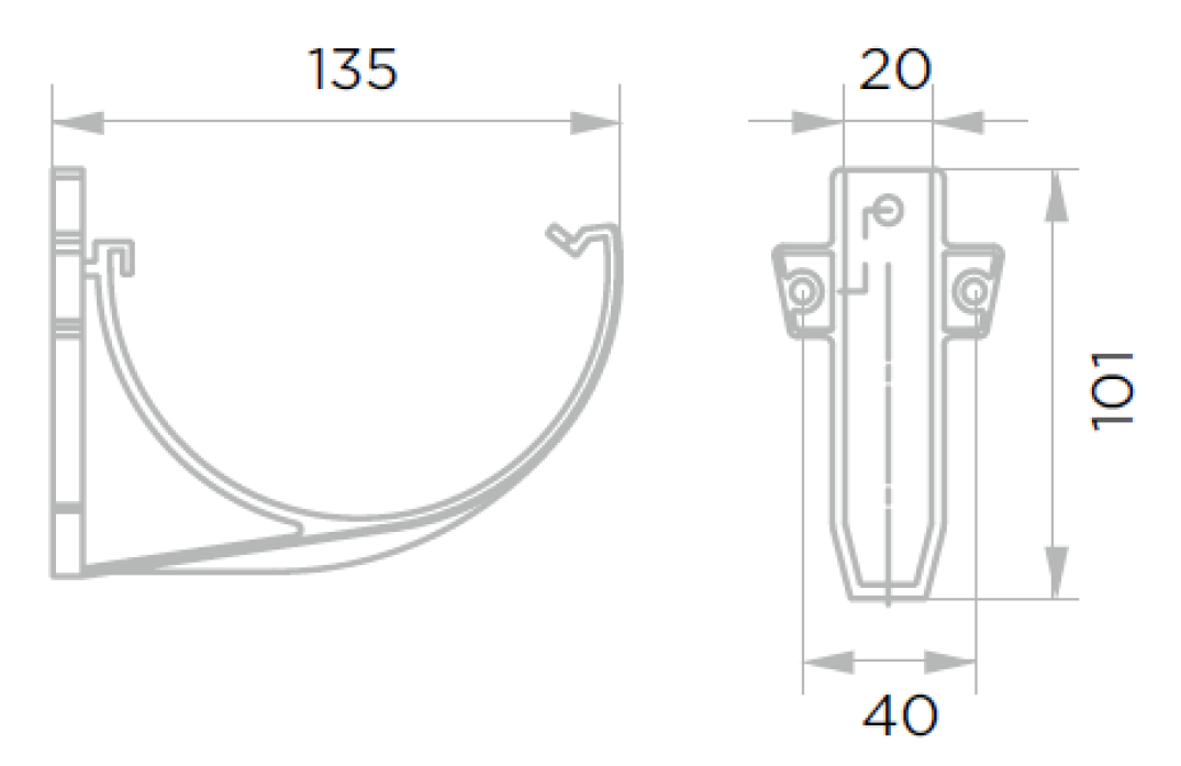 Кронштейн желоба пластиковый предназначен для крепления желобов и монтируется напрямую на лобовую доску либо при помощи металлических удлинителей к стропильной системе кровли. Кронштейн имеет вес в 41 грамм и толщину стенок 2,2 мм. Благодаря этому он становится прочнее и может эксплуатироваться в жестких условиях в диапазоне температур от -50 до +50 градусов. Отсутствие полостей в теле кронштейна обеспечивает максимальную жесткость и надежную фиксацию желоба в системе.