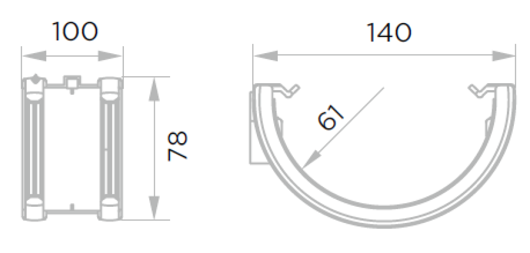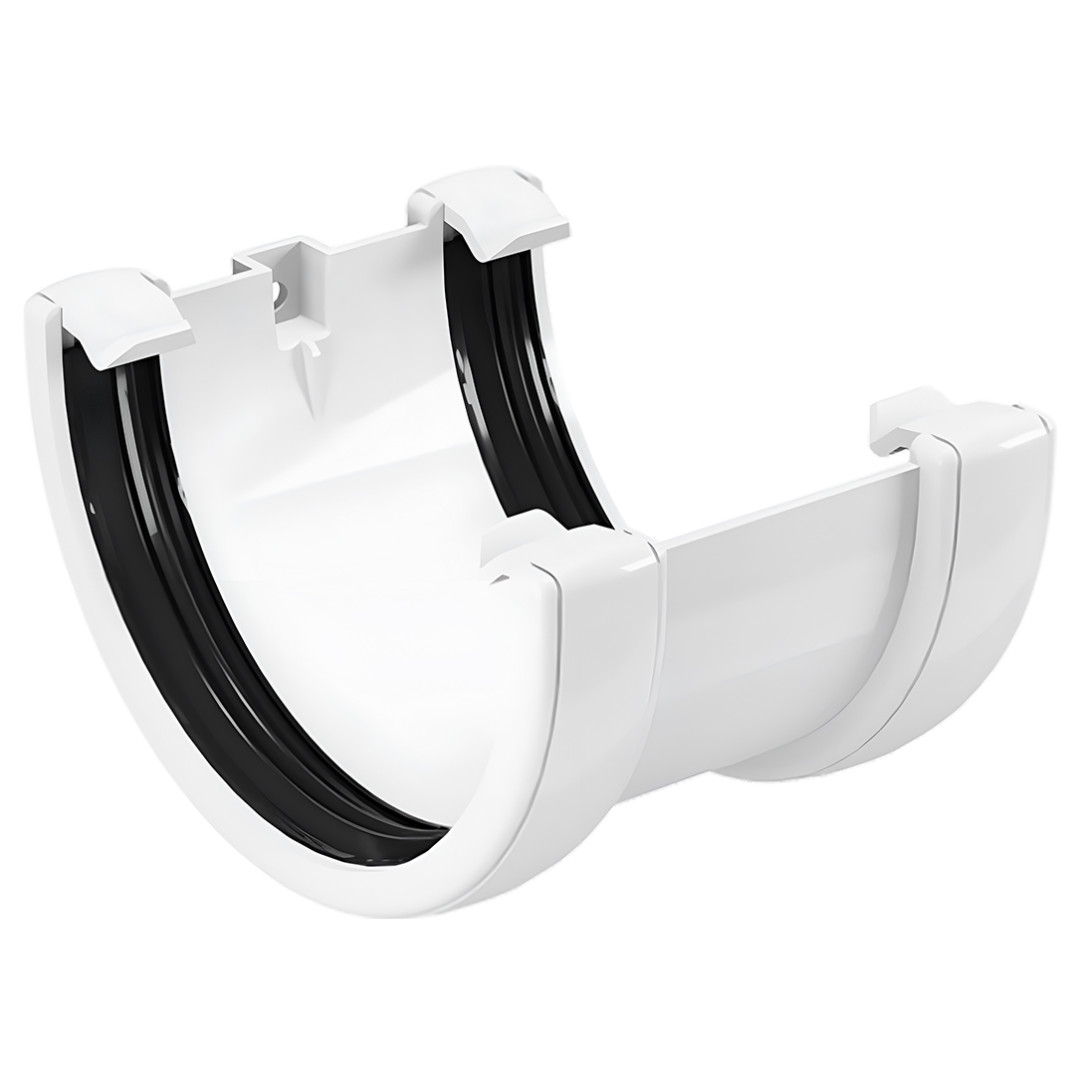 Соединитель желобов предназначен для последовательного соединения желобов между собой. Соединитель имеет большой вес в 142 грамма и толщину стенок не менее 2 мм. Благодаря этому он становится прочнее и может эксплуатироваться в жестких условиях в диапазоне температур от -50 до +50 градусов. Уплотнение в элементе достигает верхнего края. Это минимизирует риск протекания, увеличивает пропускную способность желоба и срок службы системы в целом.