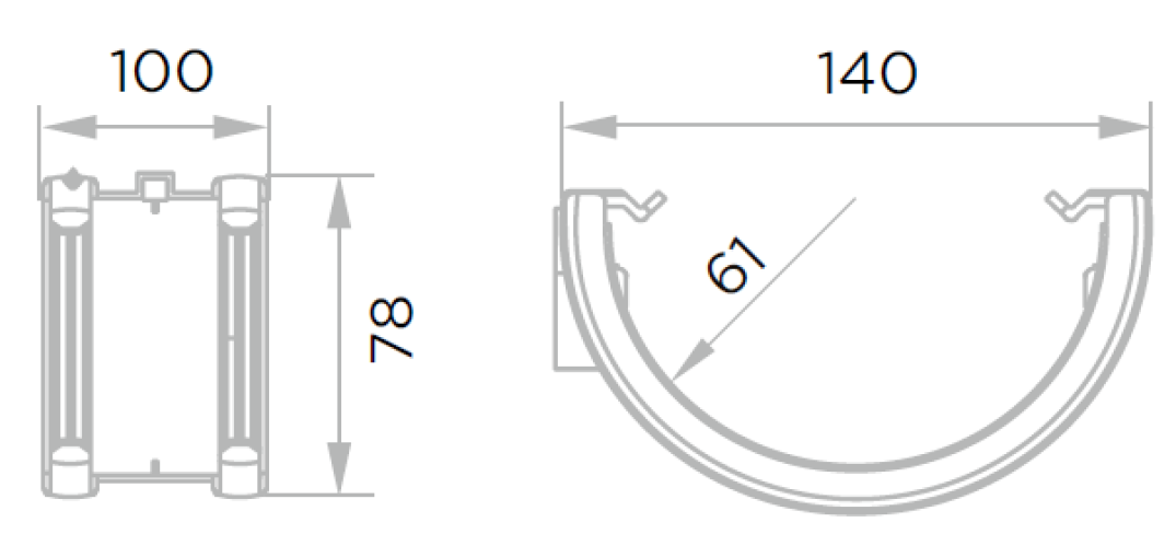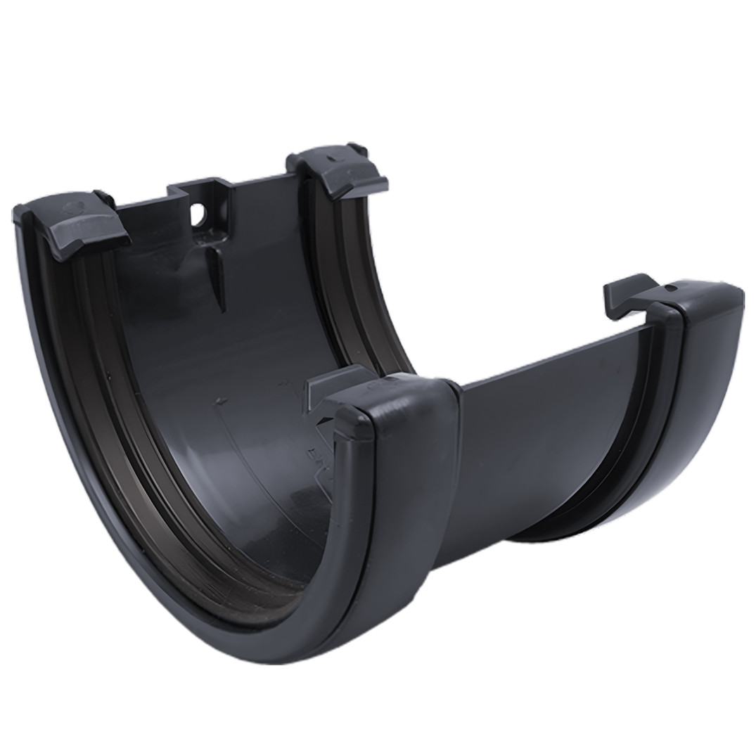 Соединитель желобов предназначен для последовательного соединения желобов между собой. Соединитель имеет большой вес в 142 грамма и толщину стенок не менее 2 мм. Благодаря этому он становится прочнее и может эксплуатироваться в жестких условиях в диапазоне температур от -50 до +50 градусов. Уплотнение в элементе достигает верхнего края. Это минимизирует риск протекания, увеличивает пропускную способность желоба и срок службы системы в целом.